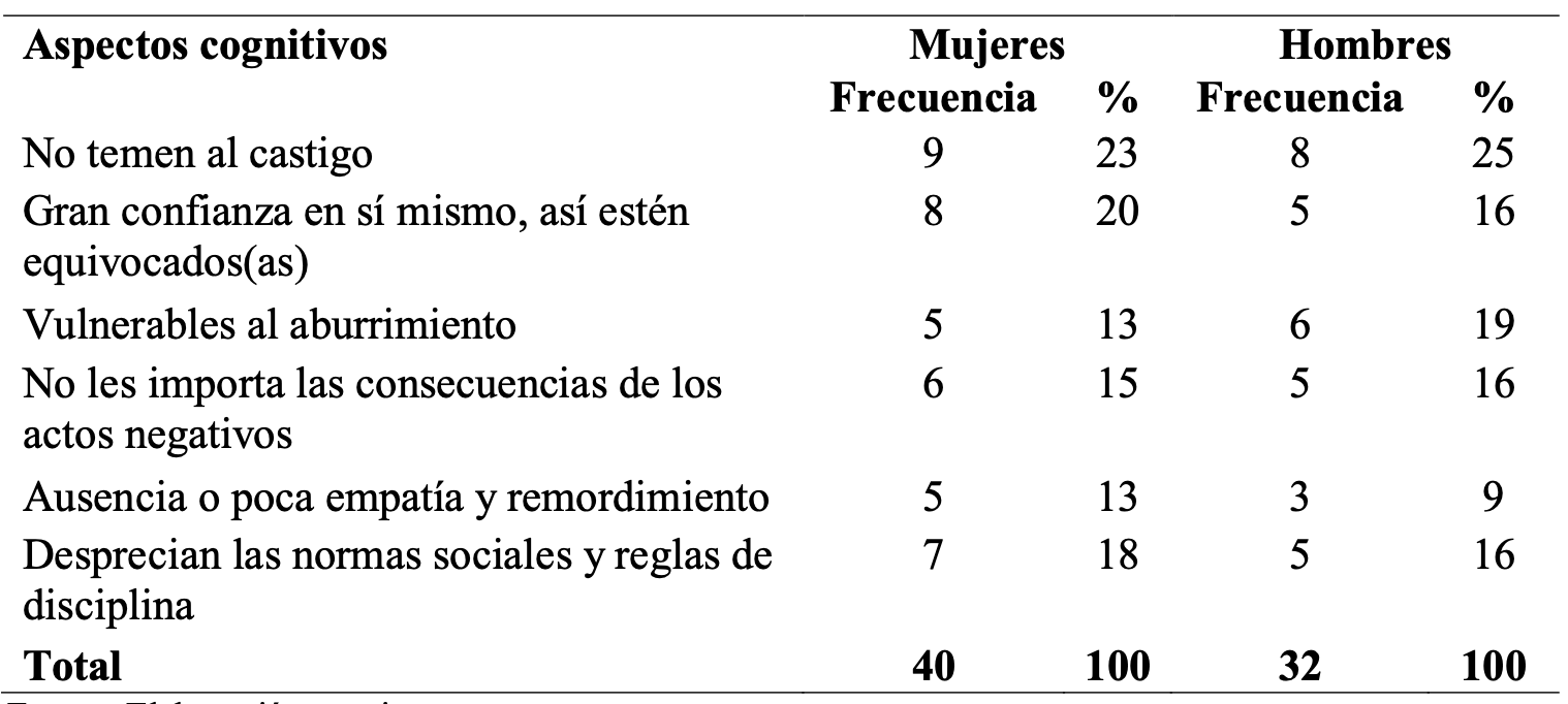 Las conductas antisociales obstaculizan el proceso de enseñanza aprendizaje. En primer lugar, resalta el fraude escolar, con primacía por el sexo femenino, como un quebrantamiento de las regulaciones y normas del colegio. Mientras que la resistencia a las autoridades escolares presenta una preponderancia en los varones, en ambos casos se muestra un rechazo hacia la institucionalidad escolar. El insuficiente control parental forma parte de las “variables que configuran el patrón conductual junto a la escuela y el entorno social” (Uribe, Sanabria, Orcasita y Castellanos, 2016). En la Tabla 8 se muestra los aspectos cognitivos que inciden como factor de riesgo hacia tendencias antisociales.