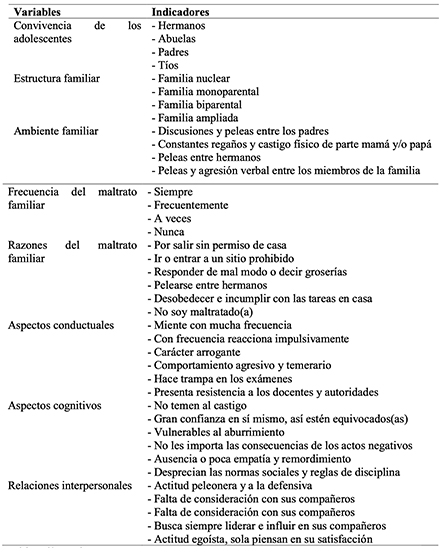 La unidad de análisis sobre la cual se obtuvo información la constituyeron estudiantes de la Unidad Educativa Informática ubicada en Portoviejo, Manabí, Ecuador. La población fue de un total de 111 estudiantes de segundo de bachillerato, de los cuales se tomó una muestra representativa y proporcional de 72 estudiantes: 40 mujeres y 32 varones. Las variables e indicadores aplicados se observan en la Tabla 1.