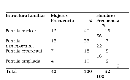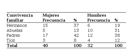 Atendiendo a los antecedentes familiares de los adolescentes no se observó una diferencia significativa entre mujeres y hombres. Los adolescentes conviven generalmente con sus progenitores en una familia nuclear. El aspecto mencionado no constituye una determinante para una conducta correcta, sino que dependerá del adecuado funcionamiento del núcleo familiar, la convivencia armónica de sus miembros y la ausencia de actitudes violentes de los padres hacia sus hijos.