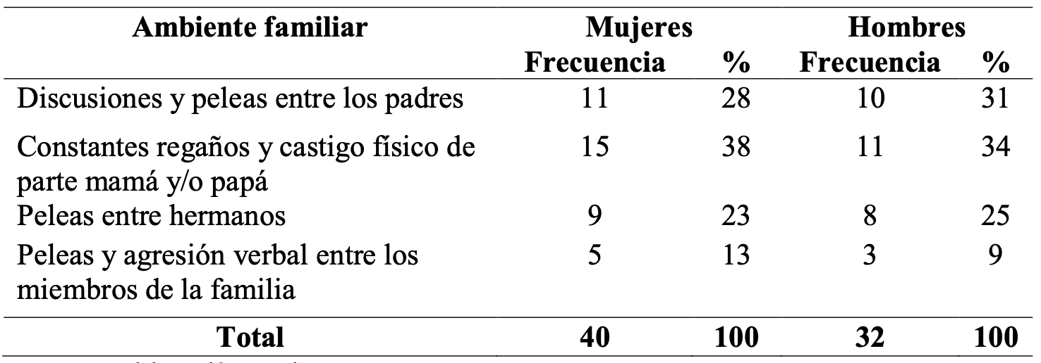 A criterio de Uribe, Sanabria, Orcasita y Castellanos (2016): no es determinante la presencia de dos padres, o la de sólo uno de ellos como factor que favorezca y/o impida el incremento de conductas antisociales de los adolescentes que se encuentran escolarizados. En familias nucleares pueden tener lugar conductas negativas por parte de uno o de ambos padres propicias para la presencia de conductas antisociales y/o violencia escolar. Entre algunos aspectos se encuentran el consumo de alcohol por parte de los padres, la adversidad familiar y las transiciones familiares (Garaigordobil y Maganto, 2016). Resultan relevantes los factores de maltrato infantil y violencia entre los padres (Rivera y Cahuana, 2016). Independientemente a la estructura, lo más importante es el adecuado funcionamiento de la familia y su capacidad para proteger y brindad afecto al menor que tiene a su cuidado. Los resultados atendiendo al ambiente familiar se muestran en la Tabla 4.