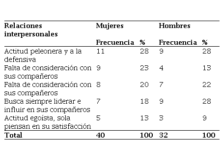 Las relaciones interpersonales constituyen el eje fundamental de una correcta comunicación, y por tanto es la expresión de la conducta. Se detecta que los estudiantes mantienen una actitud defensiva que imposibilita alcanzar mayores niveles de socialización en el ambiente escolar. Las mujeres alegan que se debe al maltrato que han sido sometidas por parte de los profesores y los estudiantes hombres.