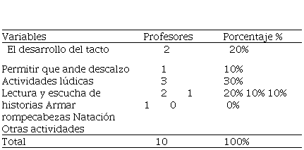 elaboración propiaLa estimulación cerebral abundante, sistemática y de calidad garantiza un ritmo vivo en el proceso de adquirir niveles cerebrales superiores y así lograr un buen nivel intelectual. Esta pregunta es esencial para comprender el desarrollo del presente trabajo académico. Al respecto, un 20% expresó que entre las estrategias que se deberían implementar para la estimulación del cerebro en los niños de preescolar consta el desarrollo del tacto; un 30% señaló como opción de respuesta las actividades lúdicas; un 20% sostuvo que una estrategia a llevar a cabo es la lectura y escucha de historias. Un 10% prefiere que el niño ande descalzo; y un porcentaje similar manifestó que prefiere el armado de rompecabezas y la natación.