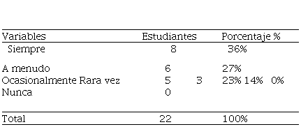 elaboración propiaEn el camino del aprendizaje debemos tener en cuenta que el cerebro aprende gradualmente dado todos los procesos neuronales implicados por lo que, conforme se produzcan las repeticiones de estímulo en las redes neuronales, se irán consolidando y modificando el cerebro y potenciando las regiones implicadas las cuales podrían, de igual forma, disminuir en caso de dejar de ser útiles. Al respecto, en esta pregunta los estudiantes consultados señalaron lo siguiente: un 36% manifestó que cree que Siempre la motivación de la parte neuronal ayudaría a controlar la parte emocional y mejorar su proceso de aprendizaje; un 27% cree que A menudo; mientras que un 23% considera que es Ocasionalmente. Finalmente, un 14% señala que Rara vez. Estas respuestas demuestran que la motivación es indispensable en la parte neuronal y, sobre todo, en el proceso de enseñanza y aprendizaje.
