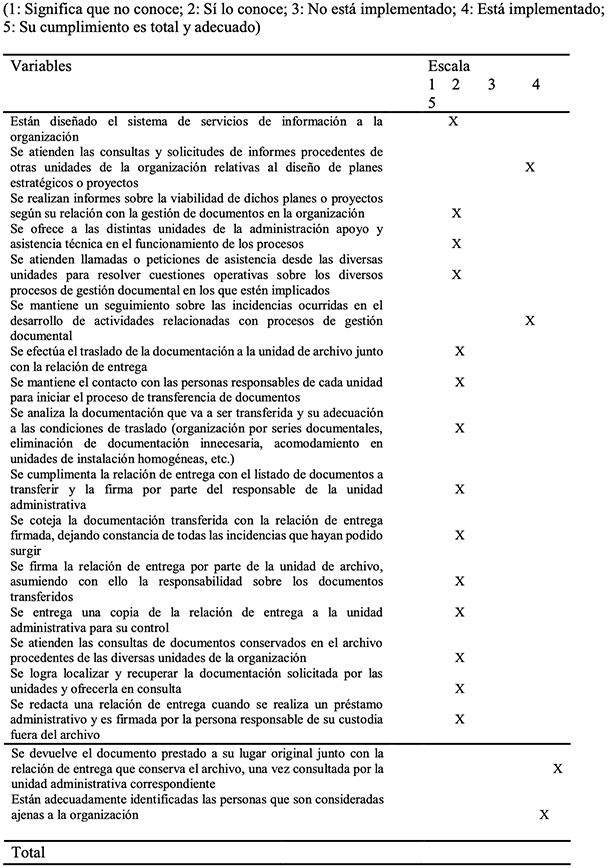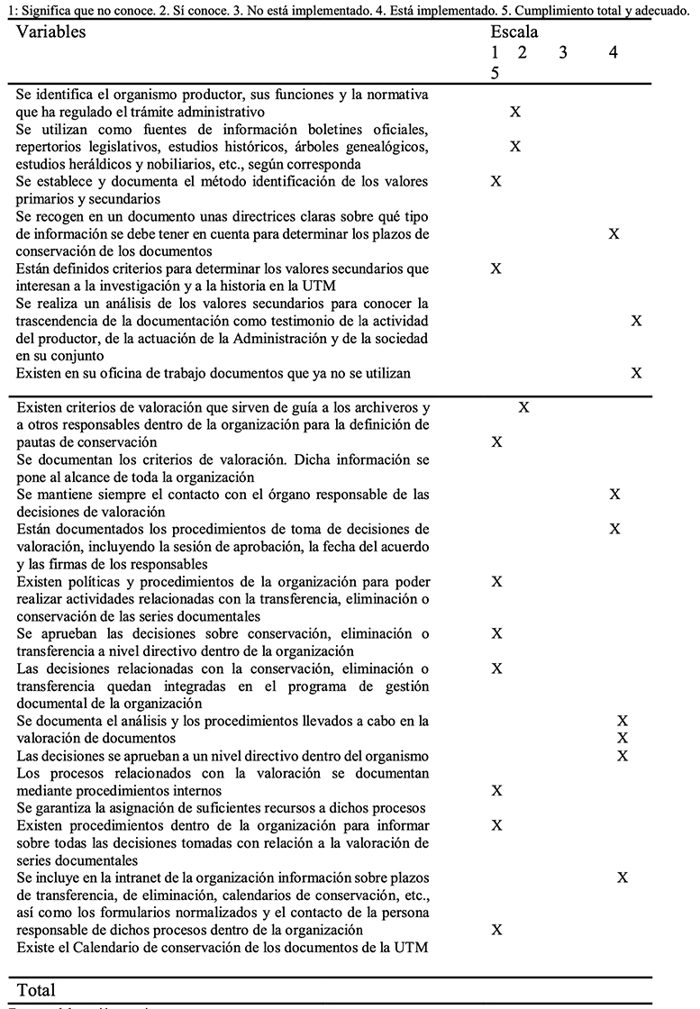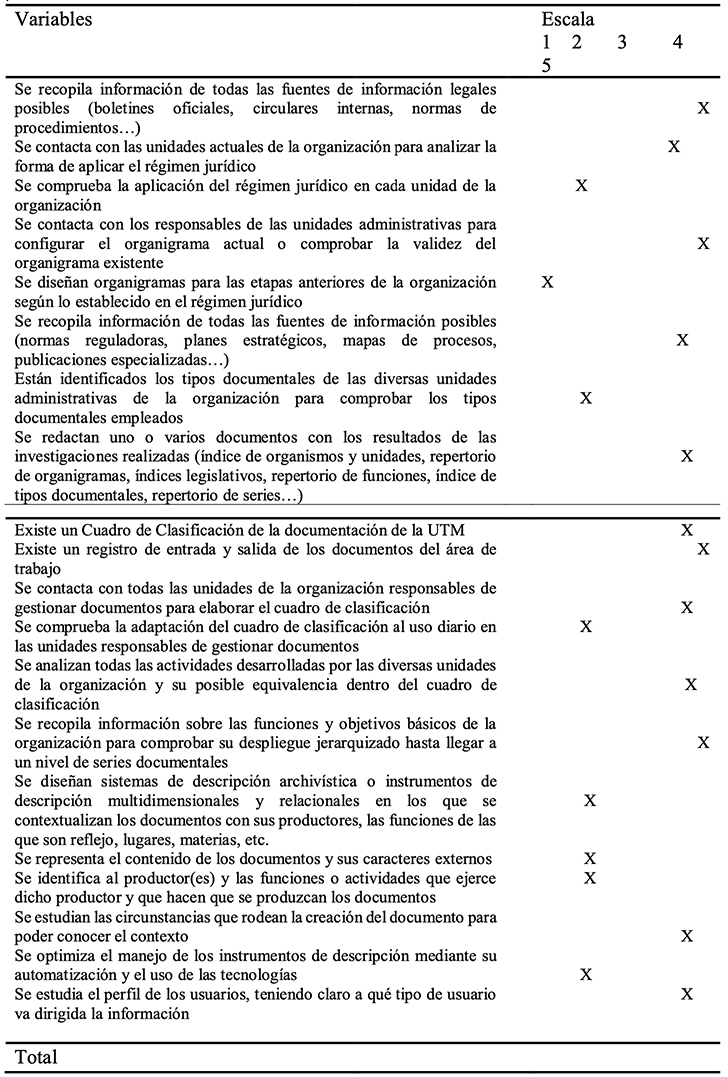 Para alcanzar los objetivos señalados, se ha considerado pertinente seguir una metodología cuali-cuantitativa. Así, a partir de una primera fase de análisis de los fundamentos de la investigación (literatura científica, doctrina archivística y documentación universitaria) se decidió utilizar la metodología de diagnóstico propuesta por el Modelo de Gestión de Documentos y Administración de Archivos (MGDAA), elaborado por la Red de Transparencia y Acceso a la Información de América Latina (RTAIAL), en el 2014, que permite determinar el nivel de eficiencia y eficacia a través de la medición del cumplimiento de los procesos de gestión documental mediante la aplicación del cuestionario de autoevaluación (Nivel inicial) en la Carrera de Bibliotecología, Documentación y Archivo, de la Universidad Técnica de Manabí, obteniendo resultados que serán debidamente expuestos, discutidos y analizados, para generar, finalmente, las conclusiones pertinentes de esta investigación.