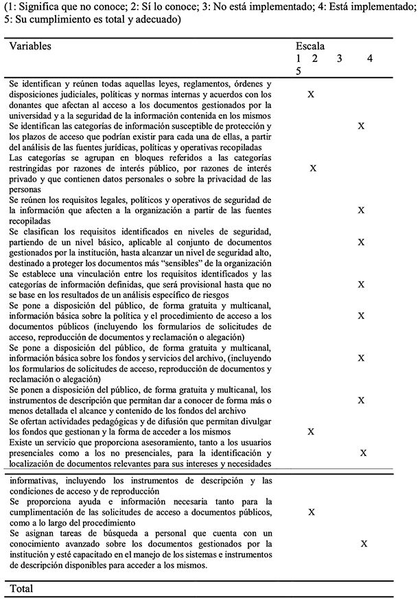 Evalúe los siguientes elementos de la sección Control de Acceso en la carrera de Bibliotecología, Documentación y Archivo, usando una escala de 1 a 5