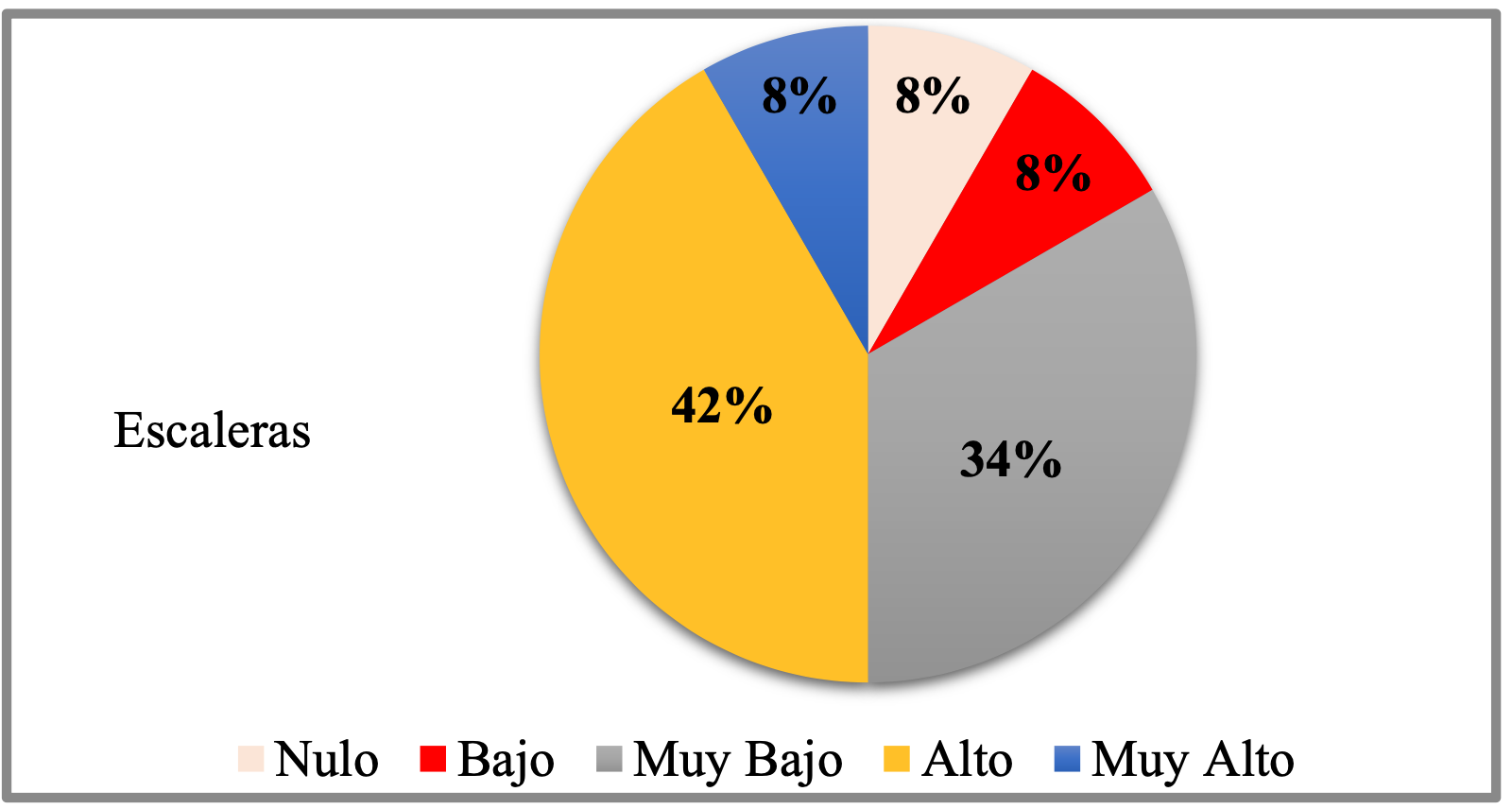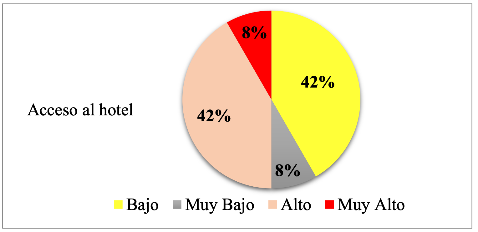 Así mismo, el 42% de los establecimientos manifestó que su grado de accesibilidad a esta instalación es alto, situación que se aprecia como favorable, ya que en su mayoría cumplen con rampas a los lados de sus escaleras y con bordillos y, por último, el 8% de los hoteles indicó que su grado de accesibilidad a esta instalación es muy alto, lo que es excelente porque está cumpliendo totalmente con lo establecido en la norma para este tipo de estructura.