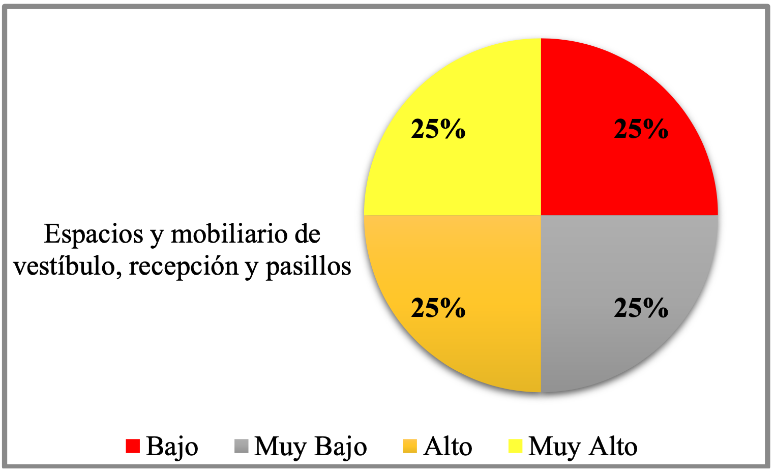 Respecto a los espacios y mobiliario de vestíbulo, recepción y pasillos, según se observa en la figura 10, el 25% de los hoteles indicaron que su grado de accesibilidad es bajo, esto significa que casi no se cumple; luego el 25% de los hoteles manifestó que su grado de accesibilidad es muy bajo, esto es, que se cumple parcialmente, además el 25% de los hoteles señalaron que su grado de accesibilidad es alto porque en su mayoría son accesibles, y por último el 25% de los hoteles indicó que es muy alto su grado de accesibilidad, entendiéndose entonces como excelente, puesto que están cumpliendo con lo estipulado en la norma.