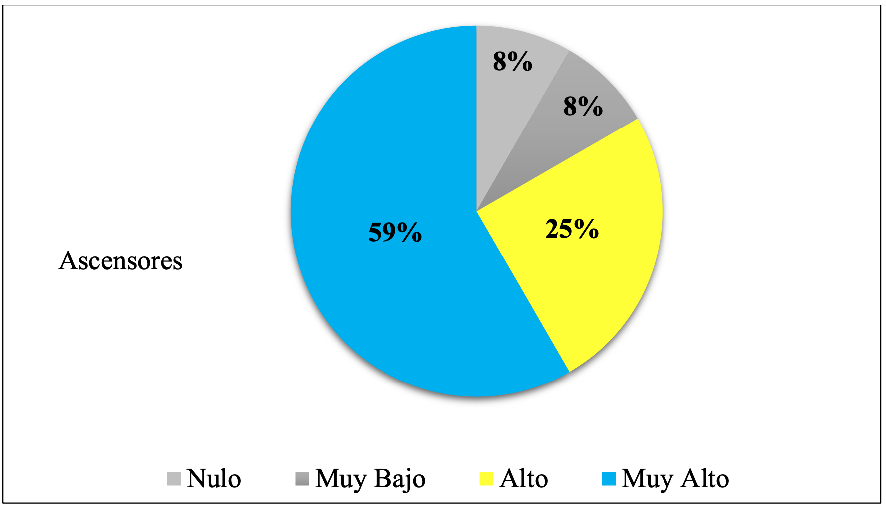 Relacionado con los ascensores, la figura 12 ilustra que el 8% de los informantes seleccionaron la opción de nulo, de allí se entiende que no cuentan con este tipo de dispositivo, de la misma forma, otro 8% de los establecimientos indicó que su grado de accesibilidad a esta instalación es muy bajo, y que aun cuando cuenta con ascensores, éstos no están adecuados para personas con discapacidad. Mientras que el 25% de los informantes indicó que su grado de accesibilidad es alto, ello significa que se está cumpliendo en este aspecto que resulta clave para las personas con discapacidad, por último, el 59% de los establecimientos sujetos de investigación, expresaron que su grado de accesibilidad a esta instalación es muy alto, esto significa que se cumple totalmente.