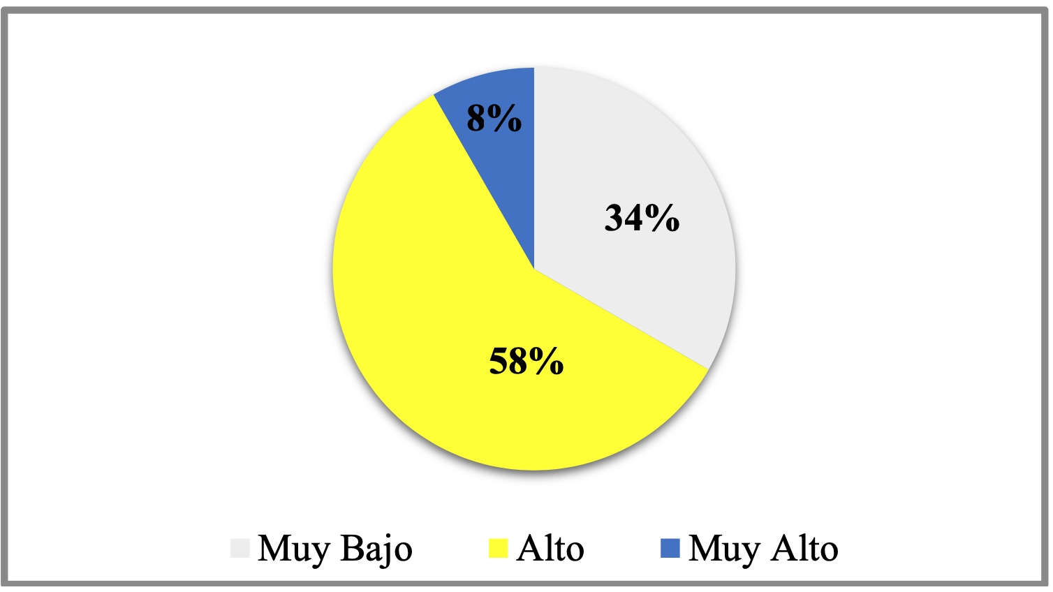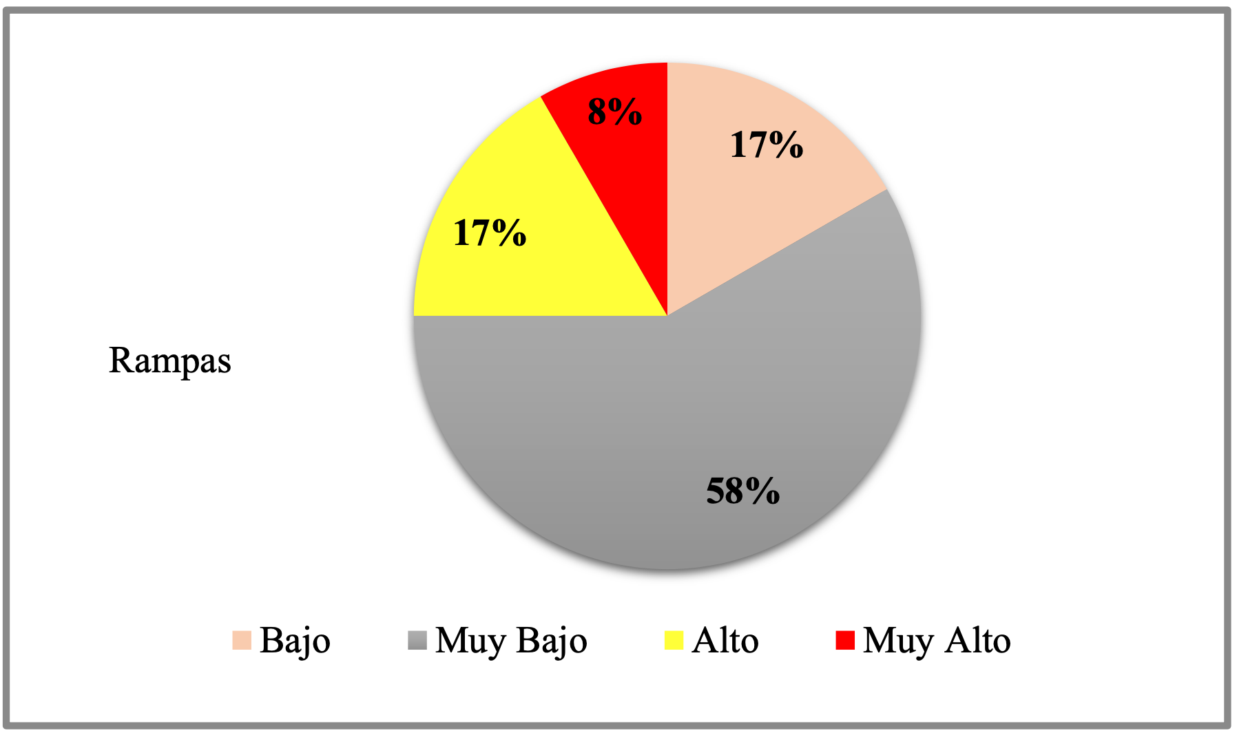 Al analizar lo que respecta a las rampas, se encontró (figura 13), que el 17% de los hoteles tienen un grado de accesibilidad bajo, o sea, no cuentan totalmente con esta instalación; el 58% dice que su grado de accesibilidad por rampas es muy bajo, el 17% indicó que es alto; por último, el 8% de los hoteles indicó que su grado de accesibilidad en esta instalación es muy alto, estos resultados dan a entender que en todas sus instalaciones cuentan con rampas. En síntesis, la mayoría de los establecimientos presentan debilidades en este aspecto, hecho que justifica la posibilidad de realizar mejoras para que sean más inclusivos.
