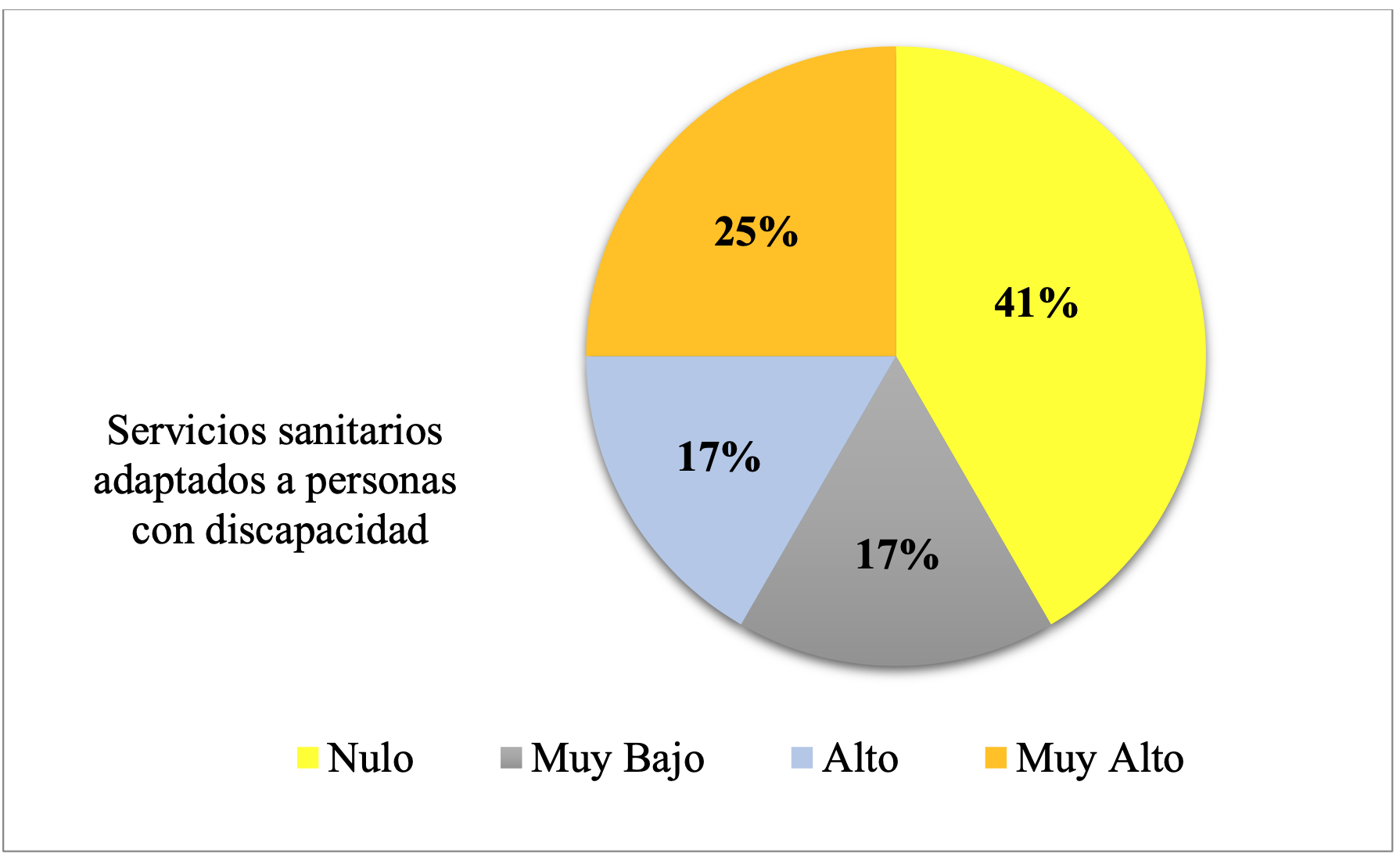 Respecto a las instalaciones de servicios sanitarios adaptados, se puede observar en la figura 14, que el 41% de los hoteles presentan un grado de accesibilidad nulo, esto implica que los baños no están adaptados para personas discapacitadas; el 17% señaló que su grado de accesibilidad es muy bajo; mientras que el 17% manifestó que su grado de accesibilidad es alto. Esto da a entender que de cierta manera se cumple en este aspecto. Finalmente, el 25% refirió que su grado de accesibilidad es muy alto, evidenciando que cumplen totalmente con este tipo de instalación, plenamente adaptada para el segmento de personas con discapacidad.
