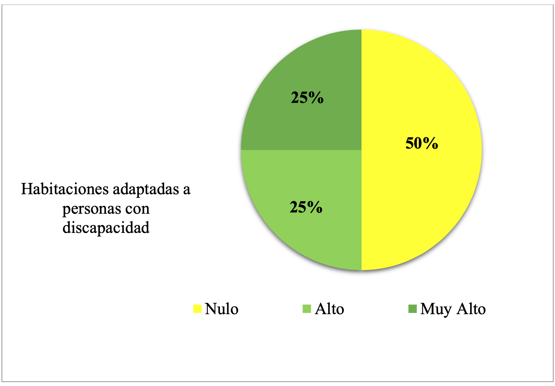 En lo que corresponde a la instalación de las habitaciones adaptadas, según lo que se puede observar en la figura 15, es que el 50% de los hoteles investigados indicaron que el grado de accesibilidad es nulo, por tanto, no cuentan con habitaciones adecuadas para este tipo de segmento de mercado, además el 25% de los hoteles indicó que su grado de accesibilidad a esta instalación es alto y es muy bueno porque cuenta con habitaciones parcialmente adecuadas, quizá no en su totalidad, pero en ciertos aspectos si está adaptada, y por último el 25% de estos establecimientos indicaron que su grado de accesibilidad en las habitaciones adaptadas es muy alto, esto significa que cumple cabalmente, lo cual resulta muy favorable, porque le está brindando a las personas con discapacidad la comodidad que por derecho les corresponde.