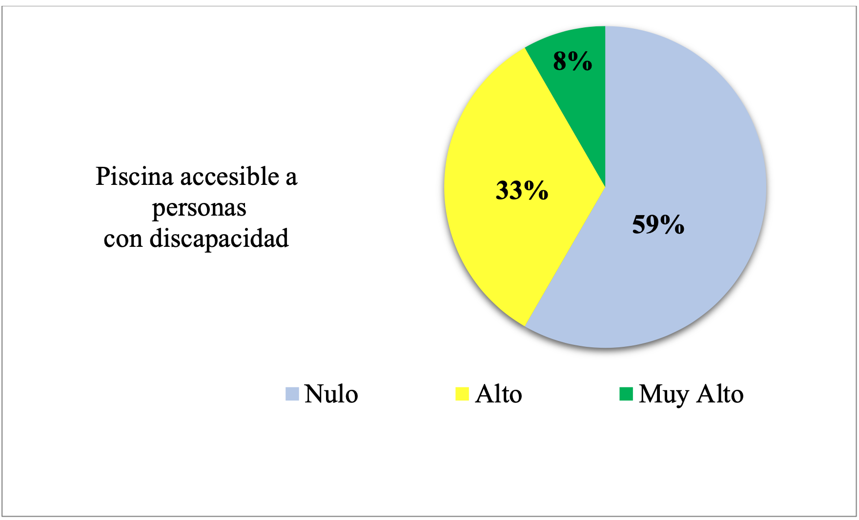 Finalmente, respecto las piscinas de uso accesible, la figura 16 señala que el 59% de los hoteles sostienen que su grado de accesibilidad es nulo, esto es porque algunos no cuenten con esta instalación, y los que sí cuentan expresan que la misma no está adaptada para este segmento de mercado. Por otro lado, el 33% de los hoteles indicó que el grado de accesibilidad en esta instalación es alto, de allí se infiere que el acondicionamiento de estas, para personas con discapacidad es parcial; por último, el 8% indicó que el grado de accesibilidad a la piscina es muy alto, entonces se entiende que está adaptada en su totalidad para personas con algún tipo de discapacidad.
