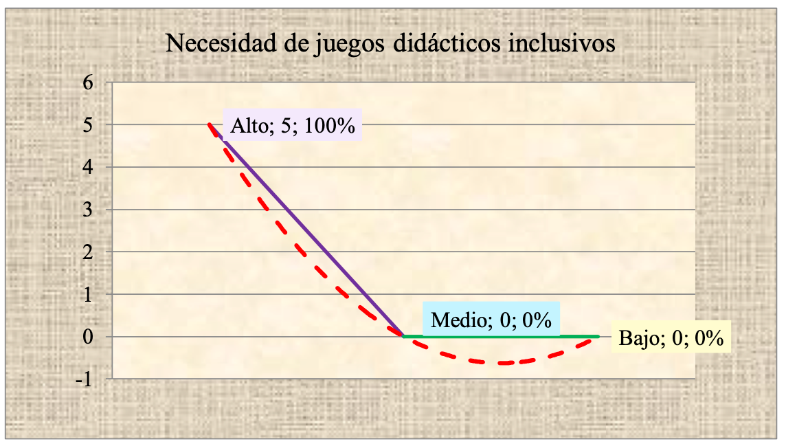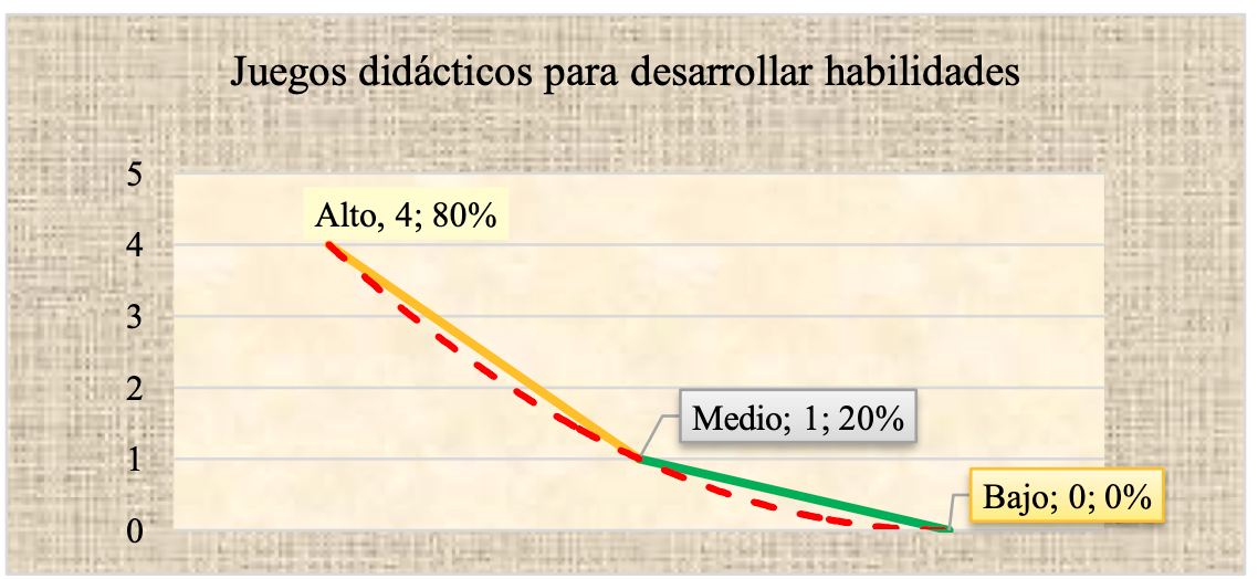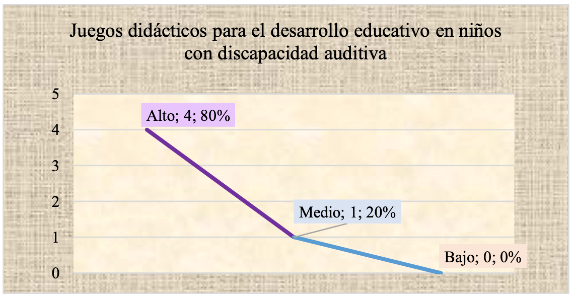 El 80% de los involucrados indicaron la existencia de un nivel alto en cuanto a la implementación de juegos didácticos puesto que ello permitirá desarrollar habilidades, y el 20% indicó estar de acuerdo, considerando un nivel medio. Este resultado permite identificar que, efectivamente los juegos didácticos son herramientas útiles que ayudan a mejorar el estado de los estudiantes con discapacidad auditiva.