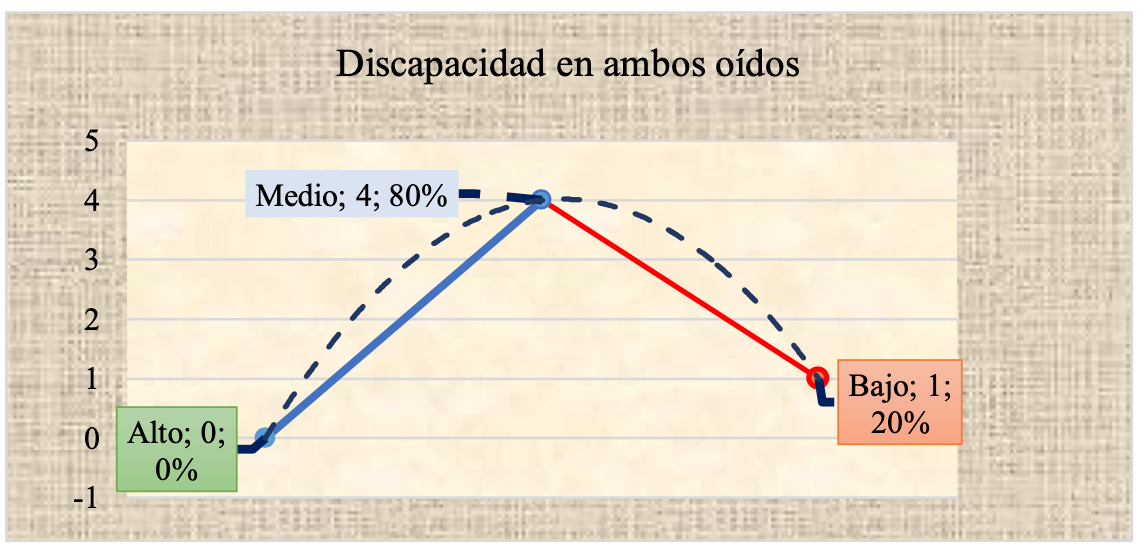 En esta pregunta respecto a si la discapacidad audita, el 80% de los encuestados respondió que en ambos oídos, mientras el 20% manifestó que su discapacidad auditiva es nivel bajo. Esto permite identificar que, no existe nivel alto de discapacidad auditiva en ambos oídos, por lo tanto, se debe trabajar incorporando juegos didácticos inclusivos que permitan brindar la ayuda pertinente a fin de atender a este grupo de atención prioritaria.