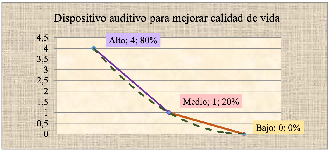 De un total de las 5 personas encuestadas, el 80% indicó que le gustaría adquirir un dispositivo auditivo para mejorar su calidad de vida, y el 20% manifestó estar conforme con su situación. Por lo tanto, se evidencia la necesidad de contar con un tratamiento médico continuo, a fin de lograr la utilización de un dispositivo que aporte significativamente en el estado de salud de este grupo de atención prioritaria.