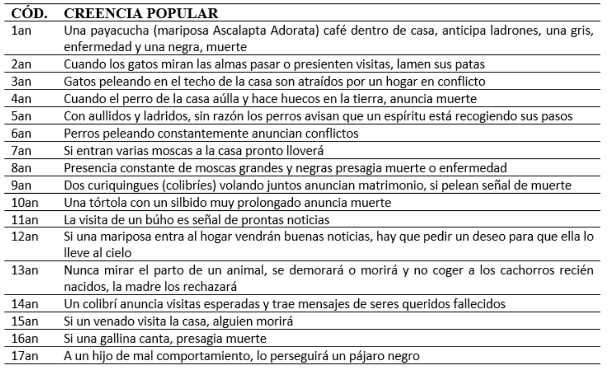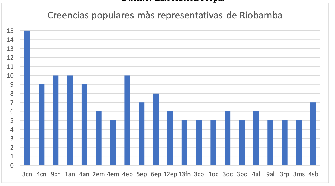 Finalmente, en el Gráfico 2 se muestran las creencias más nombradas entre la población entrevistada, debido a la gran cantidad de creencias recopiladas, se escogieron aquellas que tenía cinco o más repeticiones, lo que llevan a concluir que son las más populares y por lo tanto representativas. Se encuentran 21 creencias como las más representativas, de entre las 204 compiladas, se destacan las siguientes 6 con 15, 10 y 9 repeticiones: Poner en la muñeca del bebé una pulsera roja, aleja las malas energías (3cn, 15 rep.), Envolver a los recién nacidos evita deformaciones, asegura para el futuro un cuerpo firme, buen caminar y buen dormir. (9cn, 10 rep.), Una payacucha (mariposa Ascalapta Adorata) dentro de cara anticipa ladrones, gris enfermedad, negra muerte. (1an, 10 rep.), Si no se cumple un antojo de la embarazada, el bebé tendrá algún parecido al antojo. (4ep, 10 rep.), No cortar el cabello de los niños antes de los 5 años, puede provocarse tartamudez. (4cn, 9 rep.), Cuando el perro de la casa hace huecos en la tierra y aúlla, anuncia muerte. (4an, 9 rep.). Una vez más se puede evidenciar el cuidado de los más pequeños, como prioridad, tanto a nivel físico como espiritual.