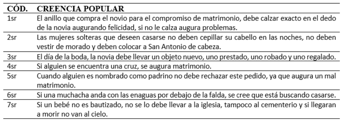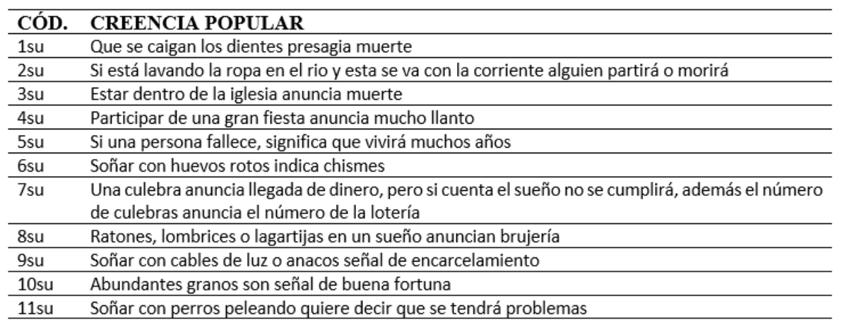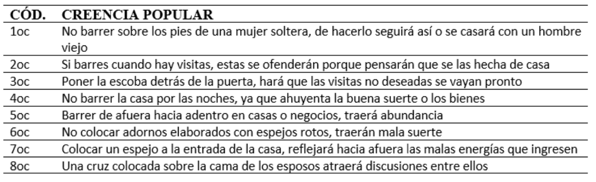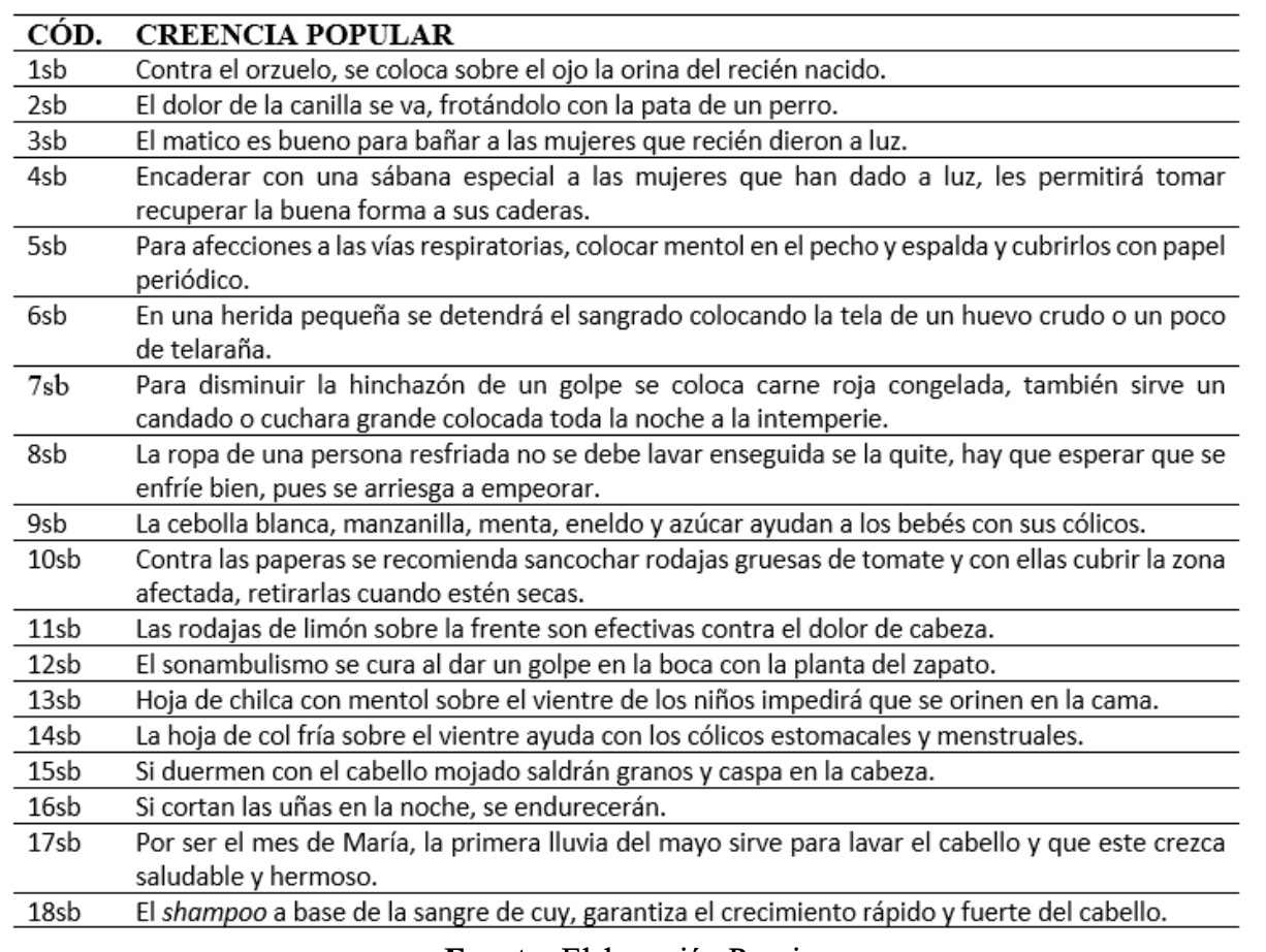 Luego de compilados los relatos, mediante el método analítico sintético se encontraron varios de ellos repetidos en contenido, pero cada uno con un aporte significativo que enriqueció el total de las narraciones. Una vez analizadas y sintetizadas, se obtuvo un total de 204 creencias populares, mismas que fueron agrupadas en 17 temáticas, las que se crearon de acuerdo a la naturaleza del sujeto u objeto alrededor del cual giraba el relato, así tenemos: cuidado de los niños, animales, quitar el espanto y malas energías, el embarazo y el parto, sueños, muertos y el más allá, el clima y los fenómenos naturales, celebraciones populares, objetos cotidianos, el diablo y malos espíritus, la menstruación, señales del cuerpo, alimentos, rituales de protección, causas de mala suerte, sacramentos religiosos, salud y belleza.