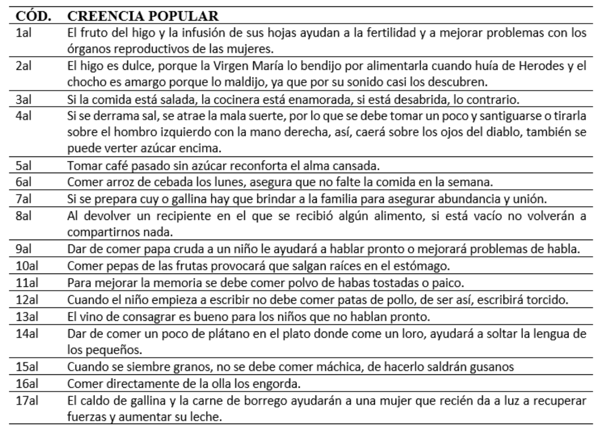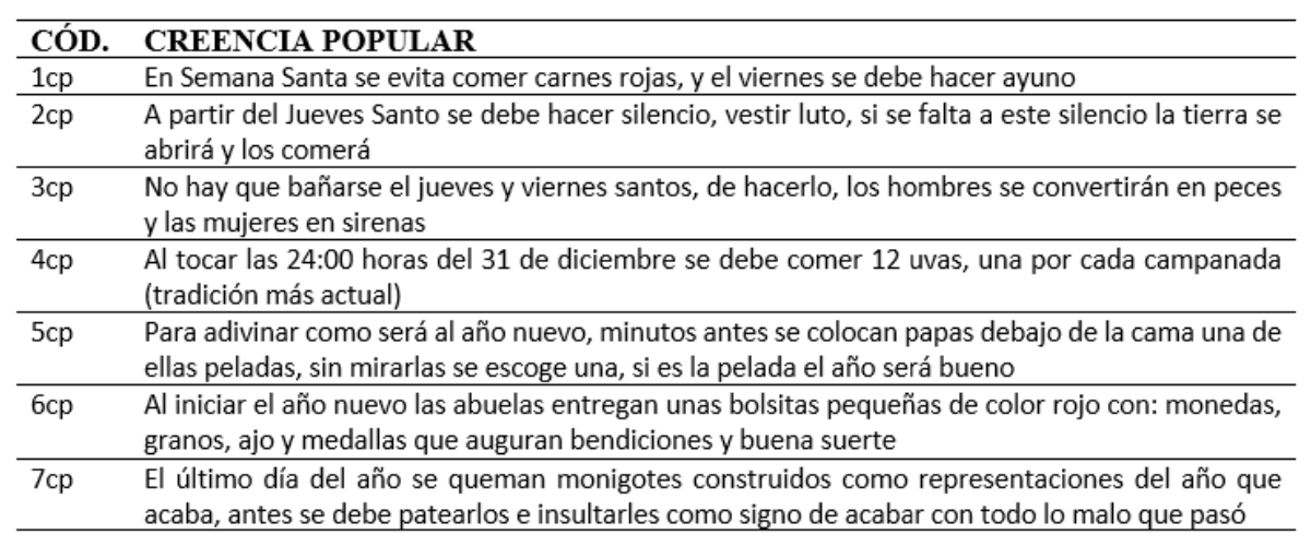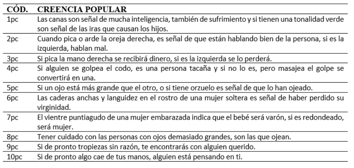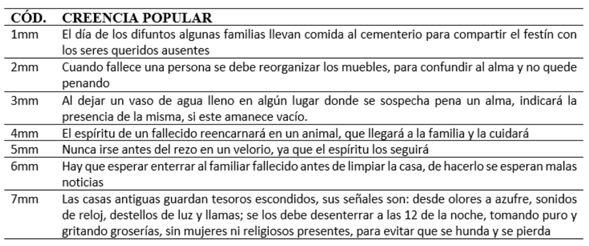 El presente documento muestra de manera resumida las creencias populares encontradas, mismas que fueron agrupadas en 17 temáticas, así como también se indica en cada una de ellas los relatos más nombrados por la población entrevistada.