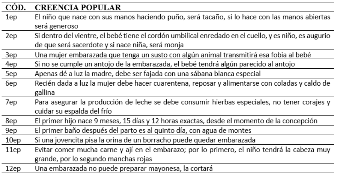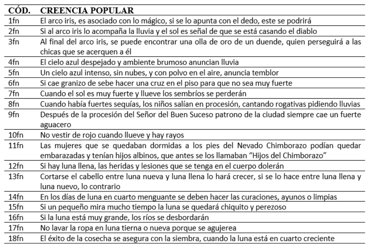 Para determinar las creencias populares más representativas de la ciudad de Riobamba, se identificaron aquellas con mayor número de repetición en las entrevistas realizadas, sobresaliendo: poner en la muñeca del bebé una pulsera roja, aleja las malas energías; envolver a los recién nacidos evita deformaciones, asegura para el futuro un cuerpo firme, buen caminar y buen dormir; una payacucha café (mariposa grande) dentro de casa anticipa ladrones, gris enfermedad, negra muerte; y si no se cumple un antojo de la embarazada, el bebé tendrá algún parecido al antojo.