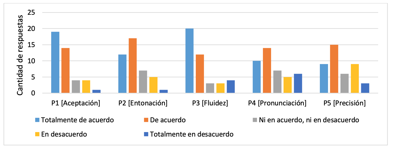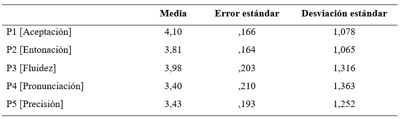 Las respuestas de los estudiantes por cada ítem están reflejadas en la Figura 1. Ninguno de los 42 cuestionarios fue invalidado y no se registraron ítems sin responder. En la primera pregunta un 78,57% de los participantes dieron una opinión favorable sobre el uso de los Jazz Chants como alternativa para promover la producción oral en la asignatura; mientras que en las restantes preguntas las respuestas con connotación positiva superaron el 50% en cada caso. Esta opinión también queda reflejada en los valores de la Tabla 5, donde la aceptación tiene la mayor media.