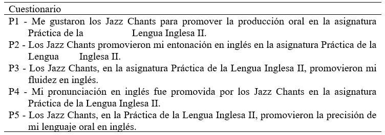 Los estudiantes implicados reflejaron a través del cuestionario, la validez y la aceptación del método empleado para promover la producción oral en la asignatura Práctica de la Lengua Inglesa II. En opinión de la mayoría de los participantes, los Jazz Chants incidieron de manera muy positiva en la mejora de su entonación, fluidez, pronunciación y precisión, lo que está estrechamente relacionado con la principal finalidad de la metodología utilizada.