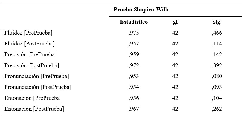 Previo al análisis estadístico de las calificaciones, se comprobó si estos datos siguen una distribución normal. La prueba estadística aplicada fue la Shapiro-Wilk con N=42 y todos los resultados muestran que los valores de calificaciones de las habilidades del estudio tienen una distribución de normalidad en p > 0,05 (Tabla 2).