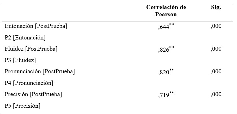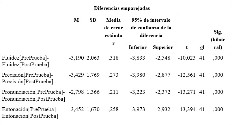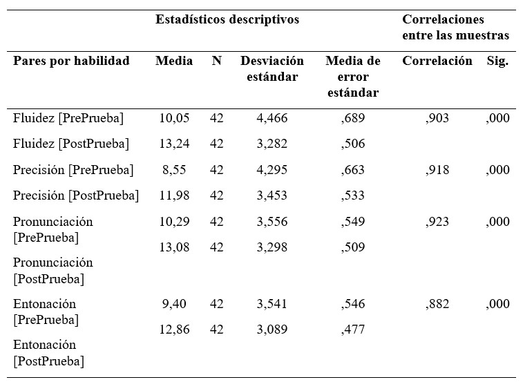 En ambas pruebas la escala de evaluación tuvo un máximo de 20 puntos, donde el mínimo para aprobar es de 10 puntos. Los estudiantes de la muestra aprobados en la preprueba representaron un 54,8% en la fluidez; un 50% en la pronunciación; un 40,5% en la precisión, y un 42,9% en la entonación. En la postprueba, los aprobados representaron un 83,3% en la fluidez; un 88,1% en la pronunciación; un 78,6% en la precisión, y un 88,1% en la entonación.