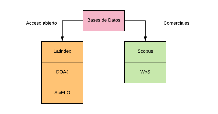 Son fuentes de información científica secundarias que permiten la indexación de las publicaciones científicas. Asimismo, para que una revista científica se integre a las mencionadas fuentes debe cumplir con los criterios de calidad que cada fuente secundaria exige. Por otro lado, permiten evaluar a las publciaciones científicas para que se incorporen en estos repositorios científicos y desde allí se establezcan su visibilidad y las métricas que le corresponden. Las bases de datos indexadoras más reconocidan a nivel mundial son Latindex, DOAJ, redalyc (cosechadoras) , SciELO, Scopus y WoS (mide métricas), como se muestra en la figura 1