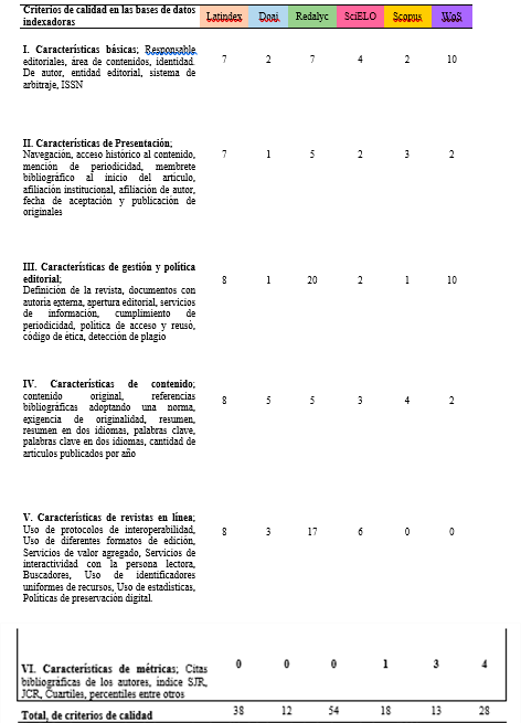 El estudio identificó los criterios de calidad para las bases de datos indexadoras como Latindex requiere 38 criterios, DOAJ 12 criterios, Redalyc 54 criterios, SciELO 18 criterios, Scopus 13 criterios y Wos 28 criterios
