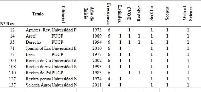 Las revistas científicas peruanas indexadas en las bases de datos como Latindex, DOAJ, Redalyc, SciELO, Scopus y WoS.