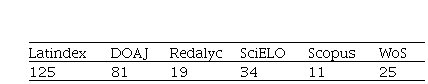 El cumplimiento de los criterios de calidad de las revistas científicas peruanas se refleja en las otras bases de datos reconocidas a nivel mundial como DOAJ (81), Redalyc (19), SciELO (34), Scopus (11) y WoS (25).
