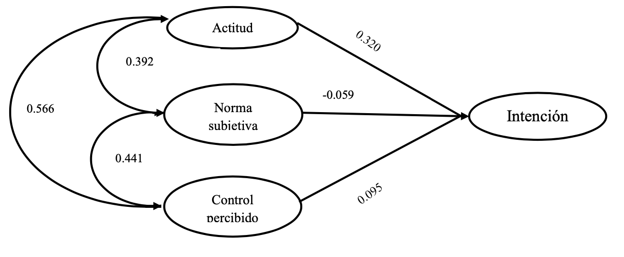 Mientras que el constructo de control percibido no determina que se realice la conducta, lo cual coincide con reportado por Baño (2020) en Ecuador con una muestra de 365 participantes respecto al endeudamiento personal con tarjeta de crédito, por lo que los resultados obtenidos coinciden a lo planteado en el modelo de la TPB respecto a que las dificultades o facilidades para emitir la conducta de estudio no resultan determinantes en la generación de la intención de la misma.
