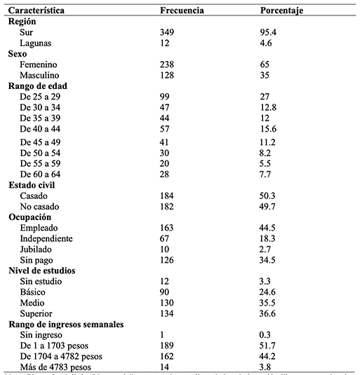 A partir del instrumento empleado, en la Tabla 2 se presentan las características sociodemográficas de la muestra, la cual se integró mayormente por mujeres (65%), en el rango de edad entre 25 y 29 años (27.05%), refirieron estar casados (50.27%), tener una ocupación de empleado (44.54%), nivel de estudios superior (36.61%), rango de ingreso semanal de su hogar de 1 a 1703 pesos (51.64%) y vivir en la región Sur de Jalisco (95.36%).