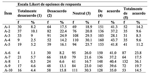 De igual manera, el instrumento empleado permitió obtener datos para medir los constructos de la TPB, permitiendo identificar la disposición de los participantes a realizar la compra de sus alimentos en supermercados, la cual se puede describir como positiva y se reflejó principalmente en el ítem A8 “lo primero que pienso cuando compro alimentos en supermercados es en la calidad”, dado que 280 (76.50%) de los participantes estuvieron de acuerdo y totalmente de acuerdo con dicha afirmación (ver Tabla 3).