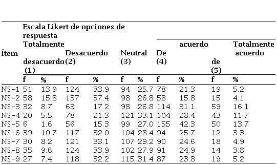 Respecto a las normas subjetivas, 173 (47.3%) de los participantes estuvieron totalmente de acuerdo o solo de acuerdo con la afirmación NS3 “nadie me dice que compre alimentos en supermercados”. Aunque, esto parece contradecirse al identificar que 97 (26.5 %) de los participantes reconocieron que esta decisión se ve influida cuando suele ser algún familiar y 71 (19.9 %) de los participantes refirieron que son sus amigos quienes les dan ese consejo de comprar en supermercados (ver Tabla 4).