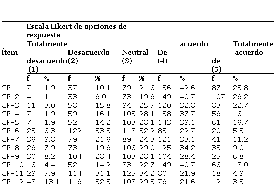 En relación al control percibido, 256 (69.94%) de los participantes estuvieron de acuerdo y totalmente de acuerdo con la afirmación CP2 “cuando se trata de alimentarme pienso en el sabor de los alimentos”. Esta afirmación refleja que el sabor de los alimentos influye en la decisión del espacio de compra, lo cual se confirma con la afirmación CP1 “cuando se trata de alimentarme pienso en el lugar para comprar alimentos” dado que 243 (66.39%) de los participantes refirieron estar de acuerdo y totalmente de acuerdo con ella (ver Tabla 5).