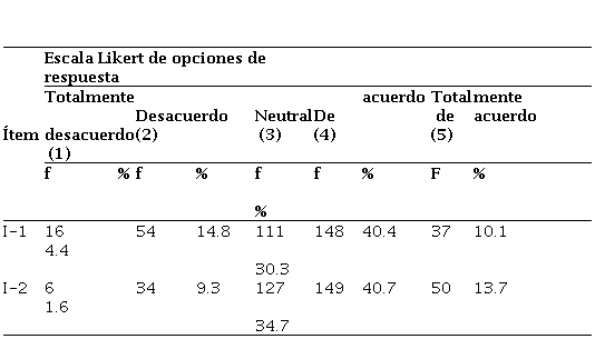 Finalmente, la intención de comprar alimentos en supermercados fue medida directamente a través de dos afirmaciones, la primera establecía I2 “me gusta comprar alimentos en supermercados” con la cual 199 (54.37%) de los participantes estuvieron de acuerdo y totalmente de acuerdo. Ante la afirmación I1 “voy al supermercado a comprar alimentos cada semana” 185 (50.55%) participantes estuvieron de acuerdo y totalmente de acuerdo (ver Tabla 6). Es decir, que la toma de la decisión de comprar alimentos en supermercados se basa en un gusto personal.