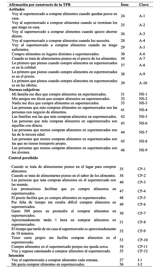 Para los fines de este artículo solo se reporta lo correspondiente al apartado uno y cuatro, en este último apartado se utilizó una escala Likert de cinco puntos para medir los constructos de la TPB. En la Tabla 2 se muestran las afirmaciones que se utilizaron como ítems para dicha medición, de los cuales diez midieron las actitudes, nueve las normas subjetivas, 12 el control percibido y dos la intención en relación a comprar alimentos en supermercados.
