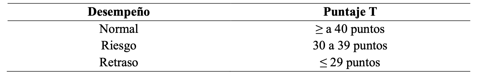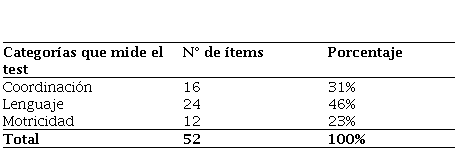 Los puntajes de las categorías e ítems, surgen a partir de la conversión de puntajes ordinarios a puntajes totales (considerando la edad de los niños), para posteriormente ser convertidos a una escala cualitativa.