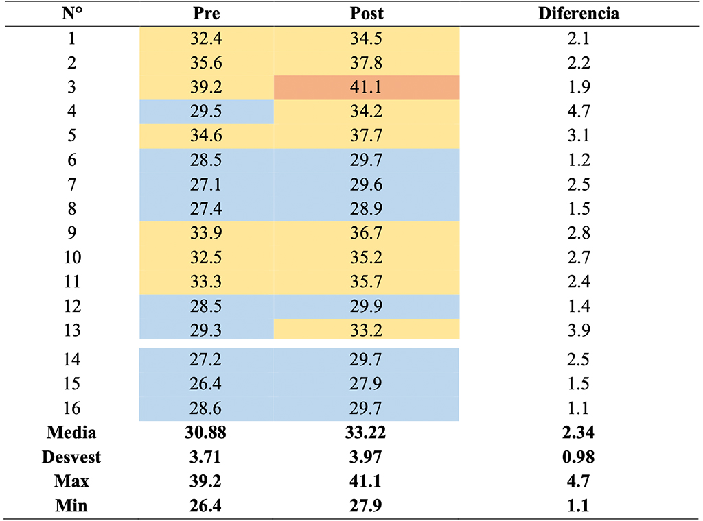 Los resultados globales del test que permitió evaluar a los niños con necesidades especiales, manifiestan una notable mejora de los resultados tras la intervención psicomotriz. Así, se observa que la media en el pre test fue de 30.88 puntos, mientras que en el post test fue de 33.22; siendo la diferencia de 2.34 puntos. En esa misma tonalidad, el límite máximo en el pre test fue de 39.9, mientras que en el post test fue de 41.1 puntos. Por su parte, el límite mínimo en el pre test fue de 26.4 puntos, mientras que en el post test, fue de 27.9 puntos. De manera que, hubo un notable incremento.