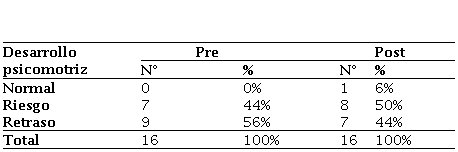 En relación a la distribución del desarrollo psicomotriz según la escala de evaluación, en el pre test existe un predominio del 56% de niños que se ubican en la escala Retraso en su desarrollo psicomotriz, en segundo lugar, se ubica a 44% de niños en la escala Riesgo en su desarrollo psicomotriz y no existe ningún niño (0%) con normalidad en su desarrollo psicomotriz. En el post test, después de la aplicación de las estrategias de intervención psicomotriz, el 50% de niños se ubica en la escala Riesgo, el 44% de niños se ubica en la escala Retraso y el 5% de niños se ubica en la escala Normal. Entonces, se desprende que el PIP ha sido exitoso, ya que los puntajes de cada niño se incrementaron, en algunos casos hasta en casi 5 puntos.