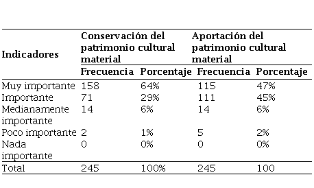 La Tabla 9 expone el criterio de los turistas respecto al nivel de importancia de la conservación y aportación del patrimonio cultural material al desarrollo turístico sostenible.