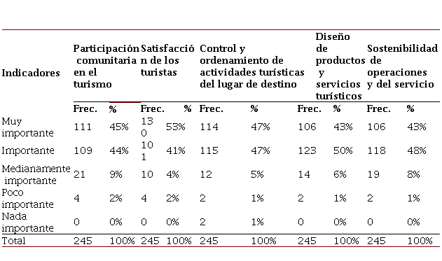 En consecuencia, según los encuestados, los siguientes son factores importantes para alcanzar desarrollo turístico sostenible, el 89% considera que la participación comunitaria en el turismo es importante; de hecho, se podría estimar que no solo sería importante sino imprescindible dado a que las comunidades son herederos del patrimonio con cuyo consentimiento se podría desplegar proyectos turísticos. El 94% considera que es fundamental también alcanzar la satisfacción de los turistas, de modo que se conviertan en embajadores de la cultura local. El 94% estima importante al control y ordenamiento de actividades turísticas del lugar de destino, por cuanto un adecuado ordenamiento permite tener un espacio más ordenado que permite planificar y gestionar las actividades turísticas. El 93% considera que el diseño de productos y servicios turísticos son importantes, pues en efecto la creación de productos, permitirá incluir de forma técnica y participativa los elementos propios del sistema turístico de manera que paulatinamente éstos sean posesionados en el mercado. El 91% manifiestan que es importante la sostenibilidad de operaciones y del servicio, de modo que se consideren aspectos de índole social, económico y ambiental.