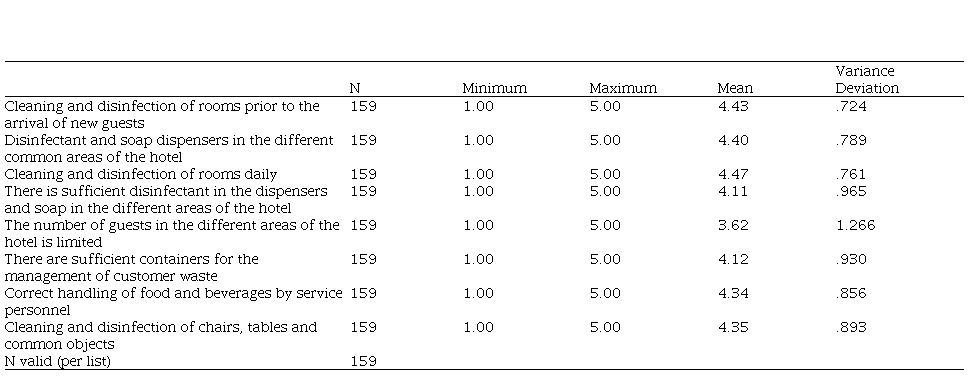 The clients' perception of the cleanliness and hygiene of the hotels in the Pesquero sector is very positive. The daily cleaning and disinfection of the rooms, the general disinfection of the rooms before the arrival of new clients, the existence of sufficient disinfectants and soaps in the different areas of the hotel, the disinfection of tables, chairs and common objects, the correct handling of food and beverages, as well as the correct management of waste and residues are all favored. These findings are consistent with those of Montero-López et al., (2022) who found in the perception of national clients in the hotels of Guardalavaca in the Holguín destination, very positive results regarding this factor. Cleanliness and hygiene in the current revitalization of tourism in the Pesquero pole plays a fundamental role in making customers feel safe during their vacations. Where hygiene and cleanliness used to be an overlooked factor for tourism destinations, nowadays these factors are of interest to travelers when making their travel related decisions, in such sense, it is suggested that hygiene and cleanliness should be the focus of attention when estimating the recovery of the accommodation industry in the post-COVID-19 stage, (Atadil & Lu, 2021). However, in this dimension it requires special attention to limit the number of customers by the different areas of the hotel, as this was the most affected indicator.