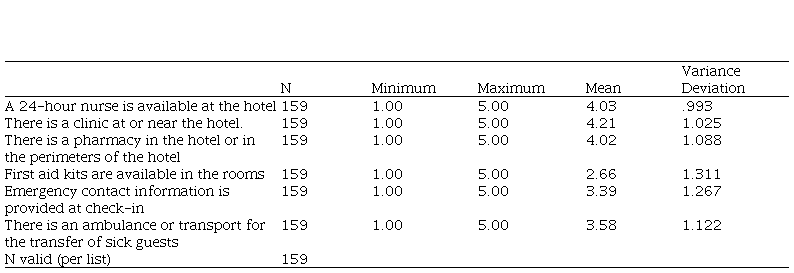 The findings regarding medical assistance show in Table 2 that clients perceive very positively the existence of a clinic in or near the hotel (M = 4.21, SD = 1.025) as well as having 24-hour health specialists (doctor and nurse) in the hotel (M = 4.03, SD = .993) and having a pharmacy in the hotel or in the hotel perimeter (M = 4.02, SD = 1.088). However, although there is a positive perception of the existence of ambulances or transportation for the transfer of clients in case of emergencies (47.1%), 41.5% assume a neutral position. In this dimension, the item least valued by guests is the existence of a first aid kit in the rooms (45.3%).