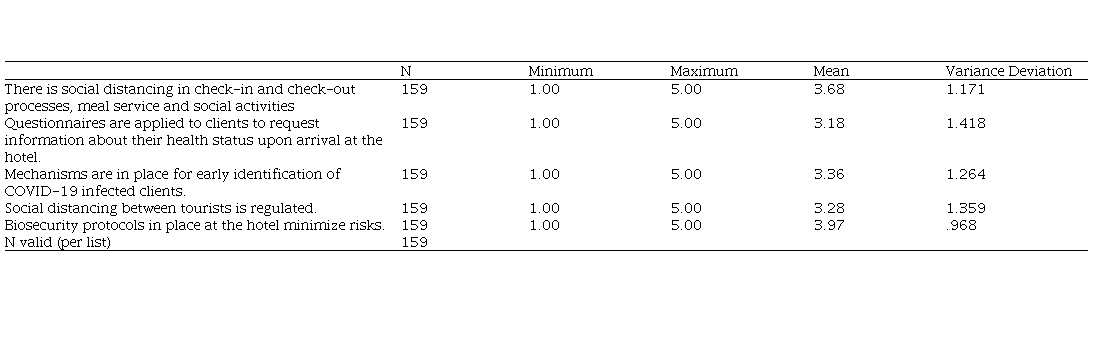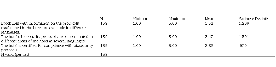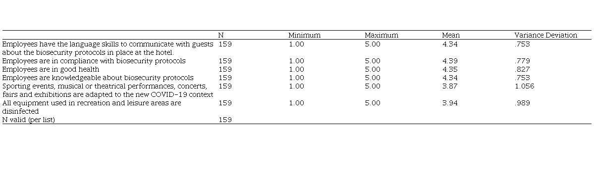 The clients rated as very positive the hotel staff's compliance with biosecurity protocols (M = 4.39, SD = ,779), the good health of the employees (M = 4.35, SD = ,827) and their knowledge of biosecurity protocols (M = 4.34, SD = ,753). More than half of the respondents 69.8% validated the ability of the hotel staff to generate sporting events, musical or theatrical performances, concerts, fairs and exhibitions adapted to the new post-Covid-19 context, likewise 66.6% valued by the employees the disinfection of the means used in the recreation and leisure areas. Language proficiency is an indicator of success in communicating with clients about the biosecurity protocols established in the hotel (M = 2.30, SD = 1.348).
