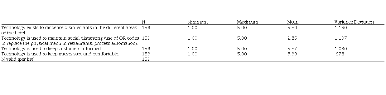 The findings found regarding the use of technology to provide greater security to customers in hotel facilities, 75.5% of respondents refer that there are technologies to provide security and comfort to customers (M = 3.99, SD = ,978), 72.3% agree that there are technologies to keep customers informed about the elements concerning the safety of the health of customers (M = 3, 87, SD = 1.060), more than half of them state that there is enough technology to dispense disinfectants in the hotel areas, on the other hand, there is a negative perception regarding the use of QR and other technologies that reduce contact with customers (M = 2.86, SD = 1.107).