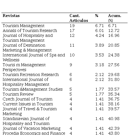 La producción científica registrada en las bases de datos citadas se distribuyó en 136 revistas. De ellas, 16 fueron las más productivas y concentran el 43.8% del total de artículos publicados. Se destacan las siguientes: Tourism Management, la revista internacional líder en temas de gestión de viajes y turismo, la cual cuenta con 19 artículos relacionados al constructo, que representan un 6.71% del total; le sigue Annals of Tourism Research con 17 investigaciones que constituyen el 6.01% y Journal of Hospitality and Tourism Management que presenta 12 publicaciones (4.24%). El 56.2% restante se distribuye de la siguiente manera: 8 revistas publicaron 3 artículos, 22 cuentan con 2 artículos en cada caso y 90 con tan solo una investigación cada una.