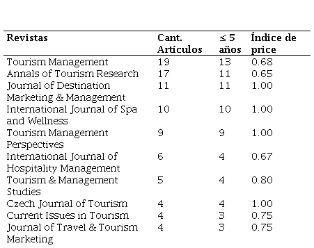 El análisis de actualidad de las referencias bibliográficas se realizó a través del cálculo del índice de Price que muestra la tasa de referencias en los últimos cinco años (2016-2020). De los 283 artículos analizados, 192 documentos pertenecen a tal período para un índice de 0.68, resultado que se considera elevado. En cuanto a las revistas más productivas, 10 de estas muestran un mayor interés por la temática en el último lustro, ya que presentan un índice de price superior a 0.50. Sobresalen con el puntaje más alto: Journal of Destination Marketing & Management, International Journal of Spa and Wellness y Czech Journal of Tourism.