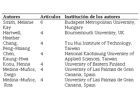 La revisión mostró un total de 499 autores diferentes donde 7 resultaron ser los más prolijos (ver tabla 3). Entre ellos, se destaca Melanie Kay Smith con 6 artículos, de origen británico, profesora de la Universidad Metropolitana de Budapest, con más de diez años de investigación en turismo de salud y numerosos trabajos de consultoría sobre la temática en disímiles países, incluso para la Comisión Europea de Viajes (ETC) y la Organización Mundial del Turismo (OMT). El resto de los investigadores (492) se dividen en: 21 autores firman 3 artículos cada uno, 50 firmaron 2 trabajos cada uno y 421 participaron en una sola publicación.